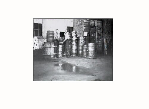 Ett par män vid skärm- och fälgmaterial på Monark ca 1938, då fotografen var cykelarbetare.