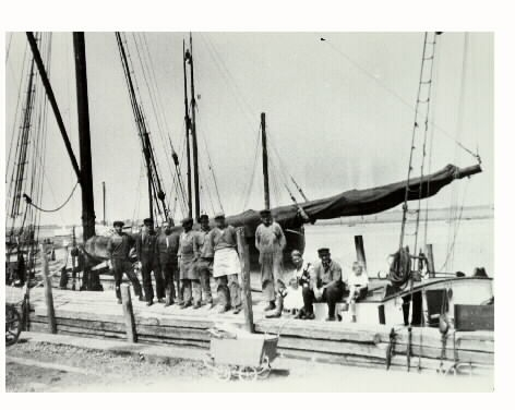 Hamnarbetare. "Lastning av timmerskuta i Varbergs hamn 1923." En man sitter med en kvinna och två små barn, vars barnvagn står i förgrunden. Ytterligare sju män står bredvid dem framför skutan.