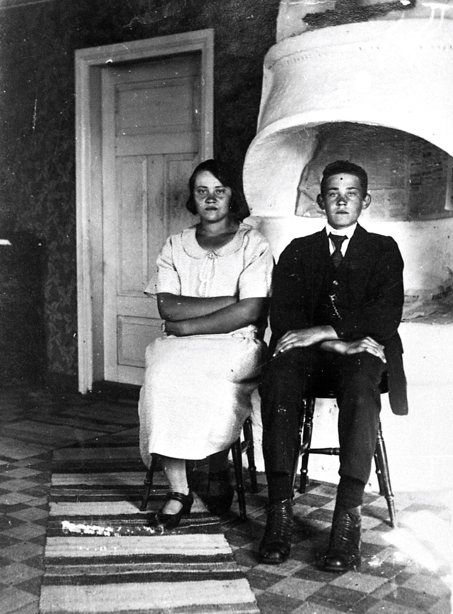 "Syskonen Edit och Anders Karlsson framför fyren i gården Kurhult, Krogsered. Omkring 1925-1930." "Fyren" är alltså den ålderdomliga spisen för öppen eldhärd med uppsvängd spiskåpa. Tidningsblad ligger på hällen och inne i kåpan. På det rutiga golvet ligger en trasmatta.