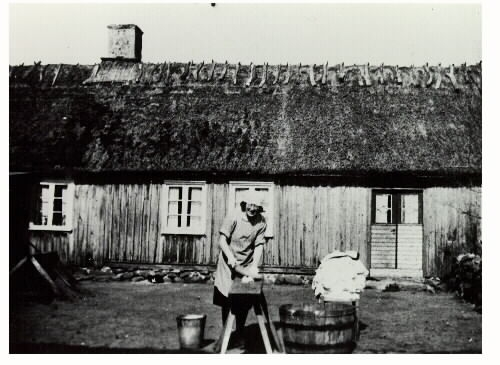 "Tvättdag för Berta Karlsson på gårdsplanen." Berta står framför bostadshuset i Galtabäck och klappar tvätten med en hink på ena sidan och ett laggat tvättkar på andra sidan. Bakom henne ligger tvätten på hög.