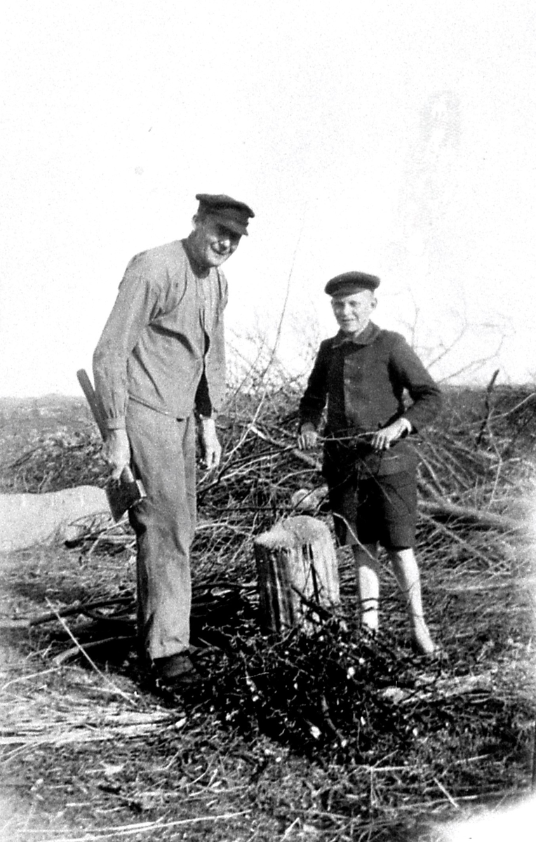 "Rishuggning, Lorensberg. Farfar Otto Bengtsson och kusin Donald Andersson i början av 1920-talet."