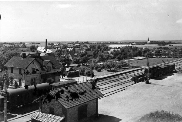 Trönninge stationssamhälle med stationsbyggnad och bangård i förgrunden. Bakom denna breder samhället ut sig med bostadshus mot omgivande odlingslandskap. En kyrka skymtar i bakgrunden.