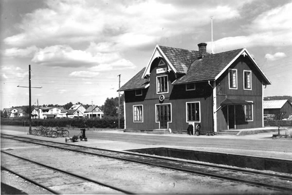 Ullareds järnvägsstation sedd från spårsidan. I bakgrunden ses bostadshus och andra byggnader.