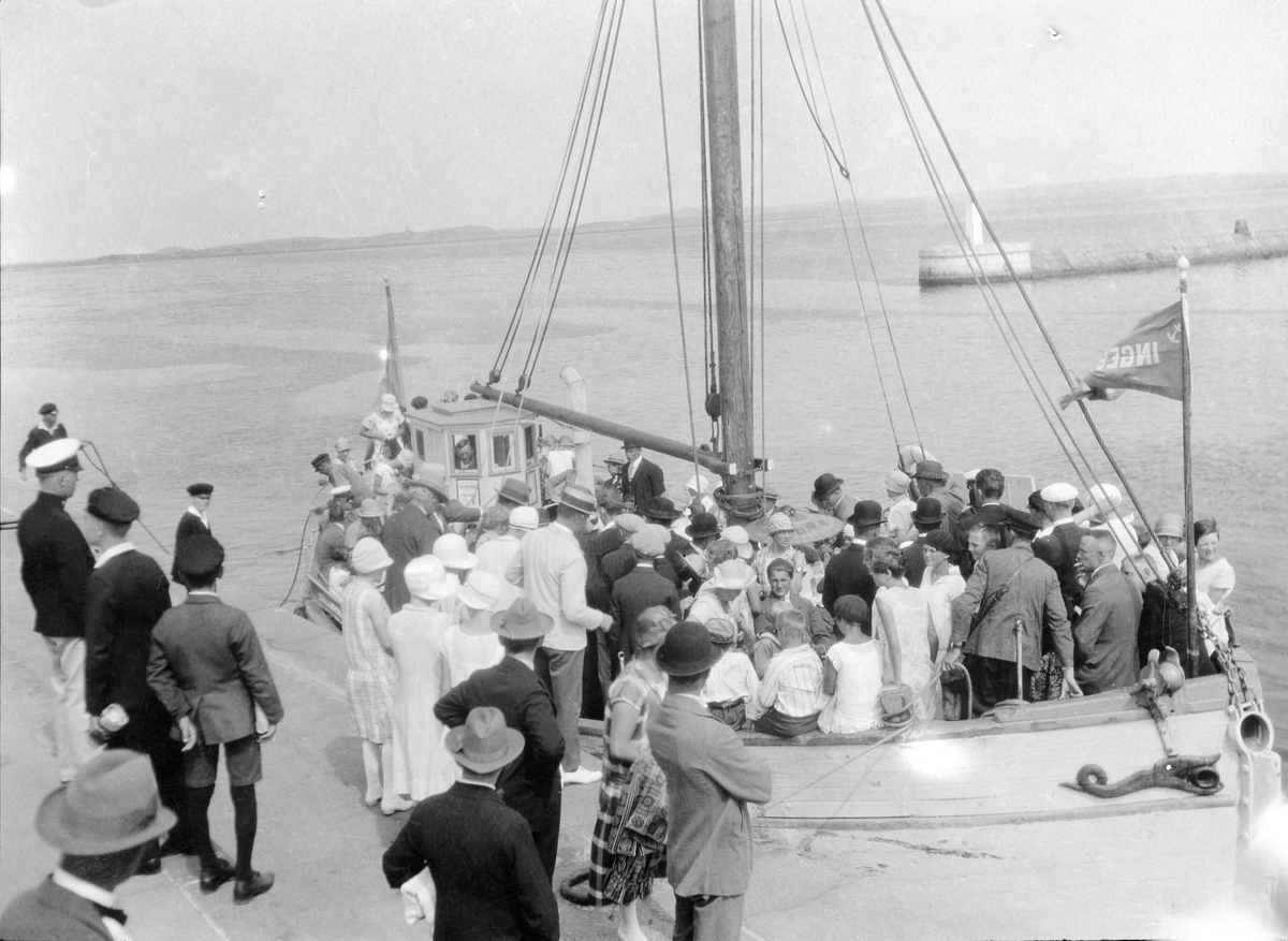 Fiskebåten "Ingeborg" i persontrafik mellan Varberg-Getterön lägger ut från Varberg. Båten är helt full med stående passagerare och kvar på kajen står en klunga kvinnor i ljusa sommarhattar och andra med filtar som får vänta till nästa tur.