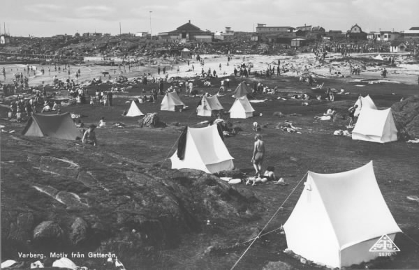Vykort, "Varberg. Motiv från Getterön". Vy över campingplatsen och stranden i 4:e vik där det myllrar av badgäster. På berget ses i mitten Sundhs restaurang och annan småskalig bebyggelse.