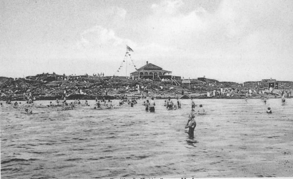 Badliv i 4:e vik på Getterön. Vy över vattnet med badande mot berget där Sundhs restaurang ligger med stor uteservering. 1920-talet.