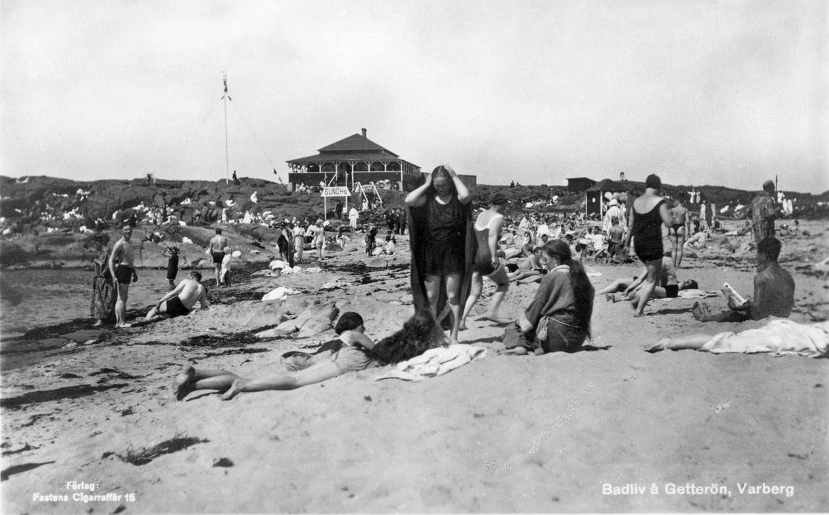 Vykort, "Badliv å Getterön, Varberg". Myllrande strandliv år 1926 i 4:e vik där en kiosk står till höger och uppe på berget ligger Sundhs restaurang. Till vänster står en man och ler mot den okände fotografen.