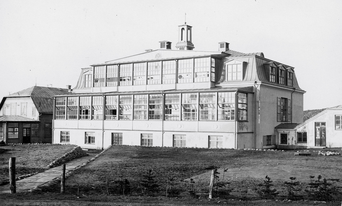 "20-talet". Paviljong 3 på Kustsanatoriet Apelviken som stod klar i på hösten 1926, ritad av sanatoriets arkitekt Rudolf Lange. Den godkändes för 128 platser, är byggd i sten med bjälklag av betong, putsade fasader och galvaniserad plåt på taket. Utöver bostadsrum, sjuksalar och ny badavdelning fanns även ett laboratorium och läkarbibliotek. Här ses den södra fasaden med solverandor i två våningar. Byggnaden står i förbindelse med paviljong 4 så man konstruerade en unik "glidhiss" eftersom det var en höjdskillnad mellan korridorerna i de två byggnaderna.