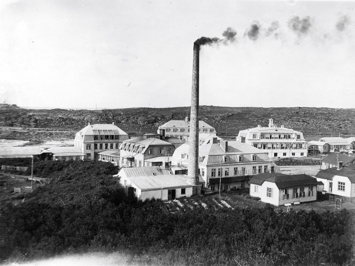 "Apelviken 1928". Kustsanatoriets kluster av byggnader sett åt nordöst från berget. I förgrunden pann- och tvätthuset med sin höga skorsten. Detta byggdes om i samband med uppförandet av paviljong 3 (tvåvåningshuset till höger baktill) 1926 och fick då en fjärde ångpanna. På ovanvåningen anlades en slöjdsal och tvättavdelningen byggdes ut.