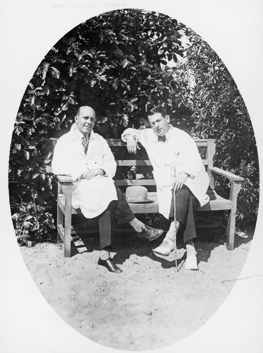 ""K.S.A:s charmör dr. Gavenius. Dr Holmqvist. 1928". De två läkarna sitter på en bänk i solen på Kustsanatoriet Apelviken. En hatt ligger mellan dem och han till höger håller i en bambukäpp. Bilden har en oval form.