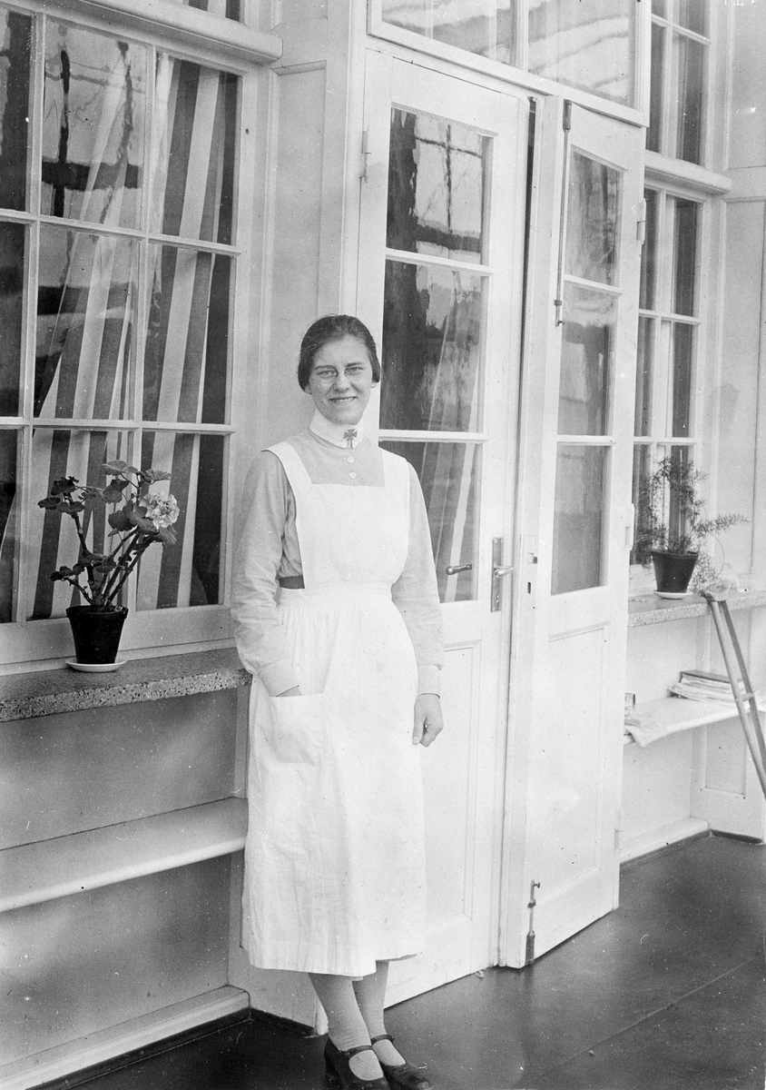 "Herta Ljungström som undersköterska". Även en liten notering med annan skrivstil och penna i ena hörnet: "Hertha 1928". Hon står ensam vid en dörr i sköterskeuniform. Till höger står en krycka lutad mot fönsterbrädan. Kustsanatoriet Apelviken.