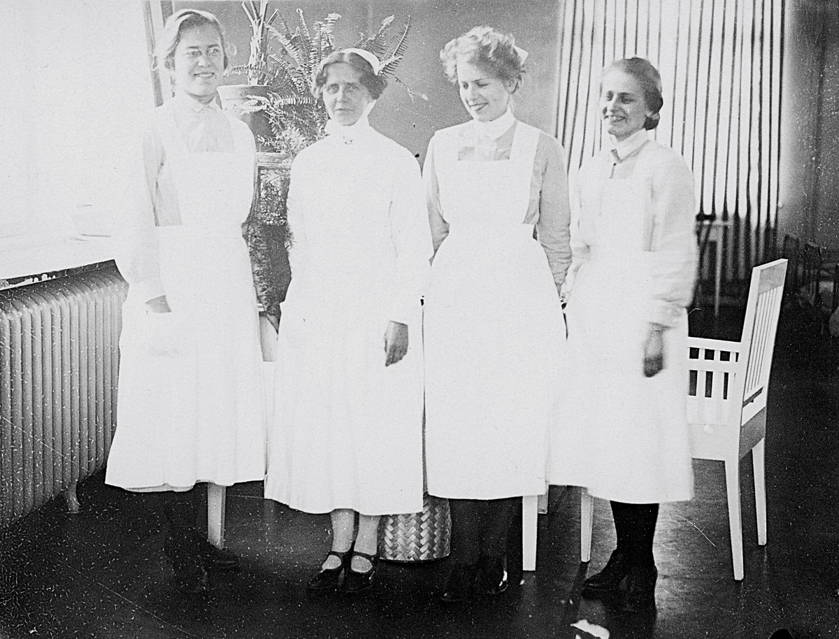 Syster Signe-Lisa, Karin Rölme, Gunhild Pettersson o. jag som elev på III A." "Den yttersta till vänster är Herta Ljungström, min syster /kors/ 1979". Kustsanatoriet Apelviken.