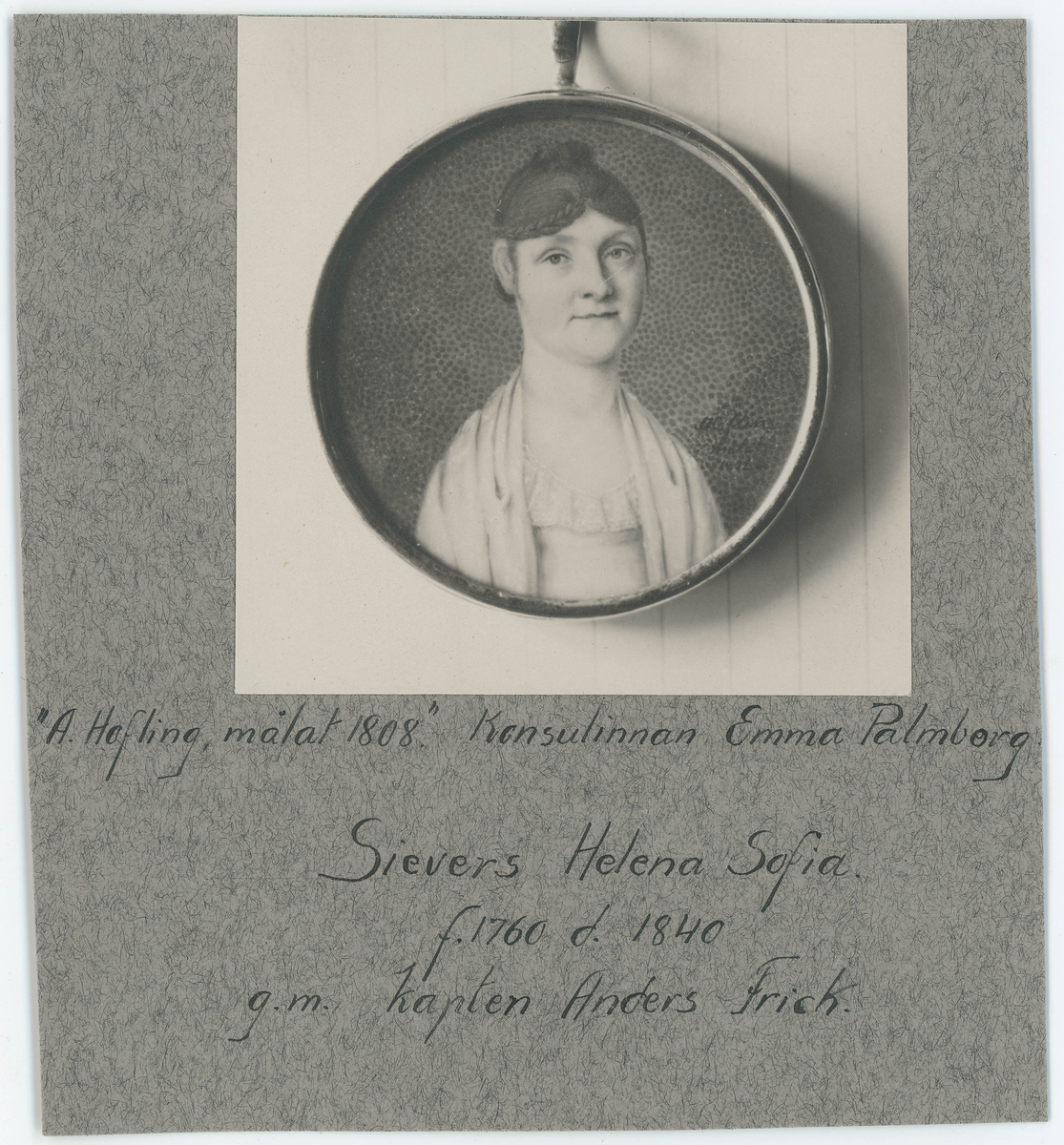 Porträtt på Helena Sofia Sievers född år 1760 och död år 1840. Gift med kapten Anders Frick.