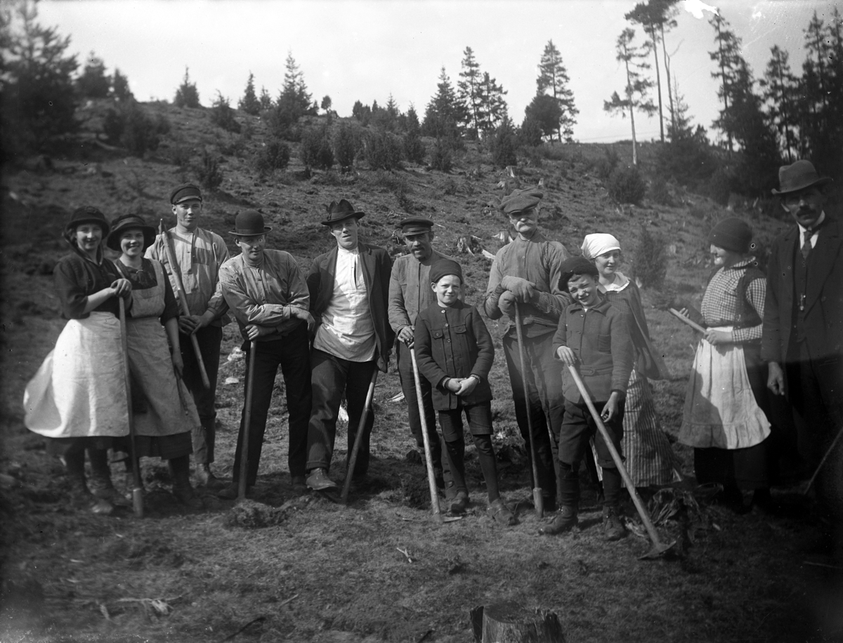 En grupp män, kvinnor och barn står i en skogsbacke med redskap i händerna, bland annat korpar och hackor.