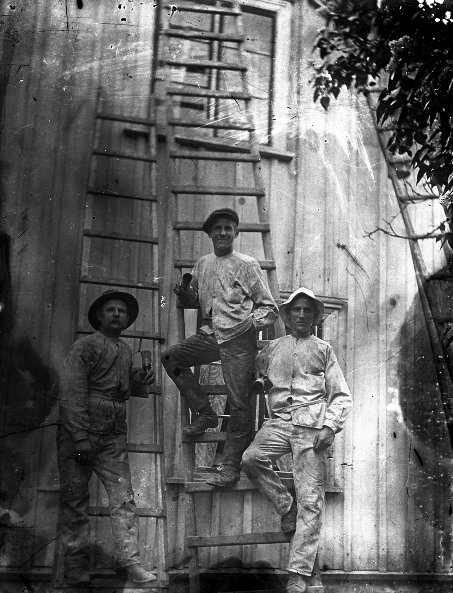 Tre yrkesmålare vid sina stegar och med penslar i händerna.