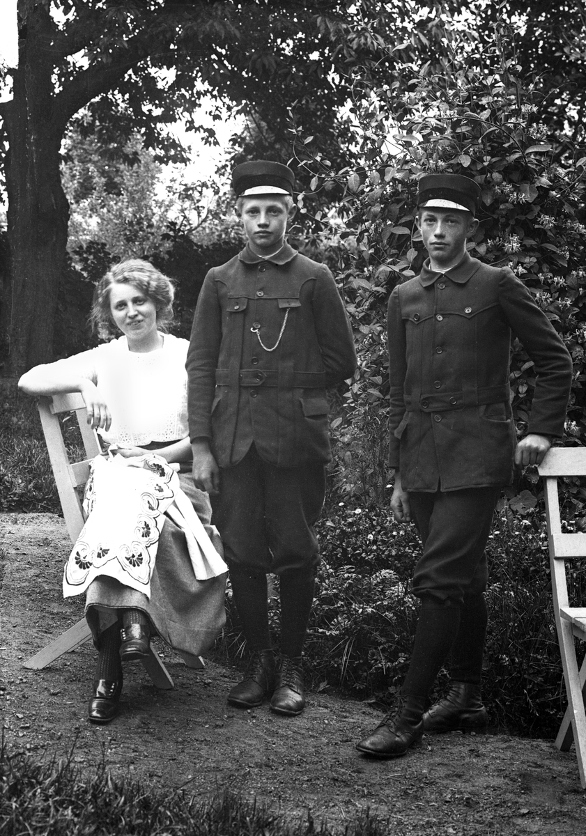 Gruppfoto av en ung kvinna och två pojkar i trädgården. Kvinnan sitter på en trädgårdsstol och har ett påbörjat broderi i knät.