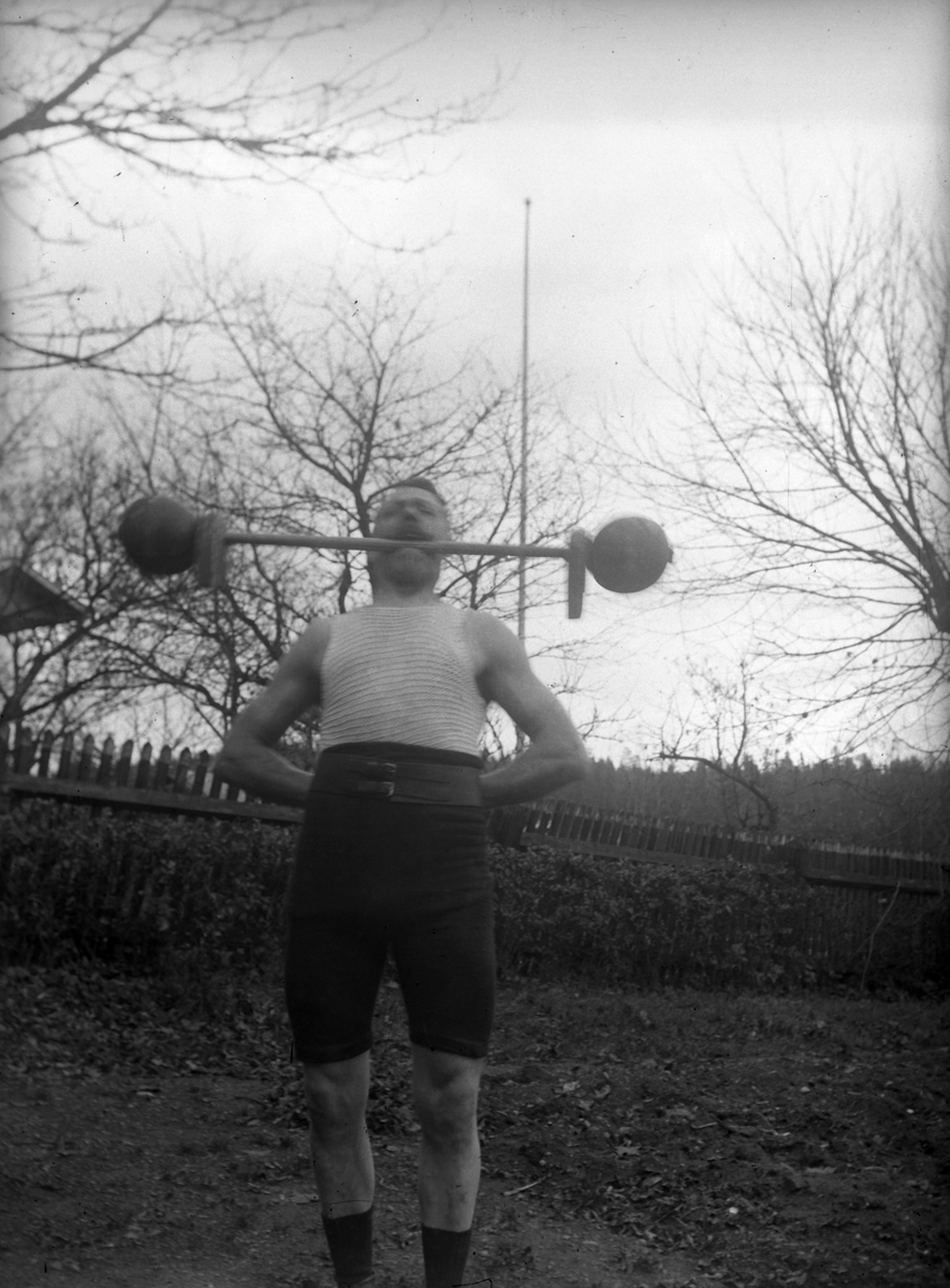 Ute i trädgården lyfter en man en skivstång och håller den i munnen.