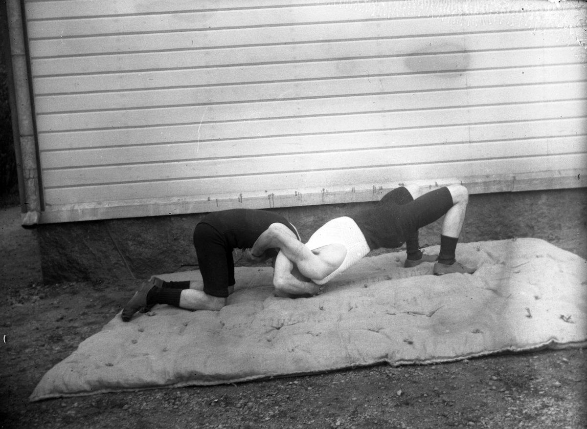 Ute i trädgården har två män gymnastikövningar på en tjock matta.