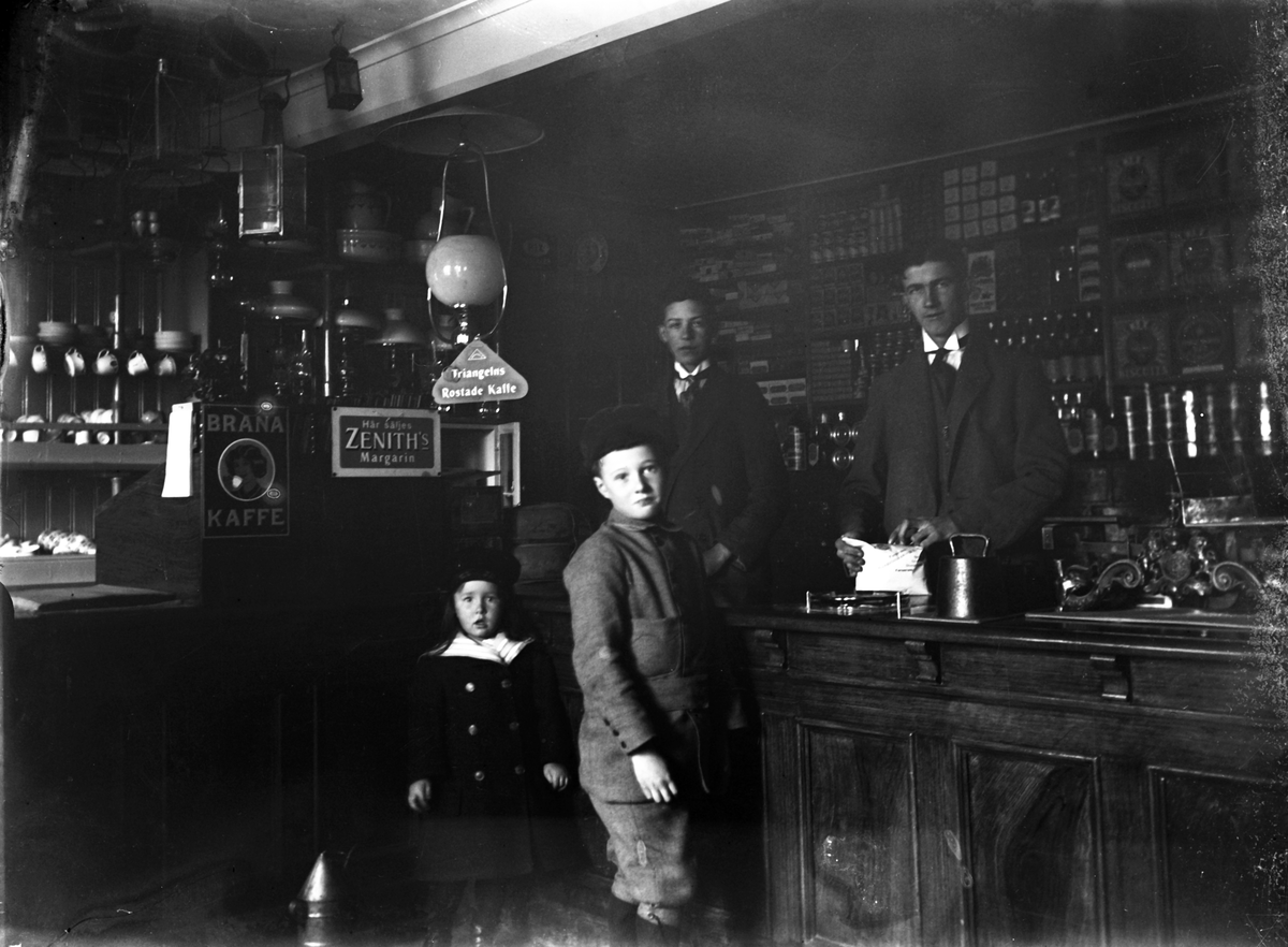 Butiksinteriör. Två expediter och två barn. På disken finns en våg med vikter och skyltar gör reklam för Zenith´s margarin och Brana kaffe. På hyllorna står bland annat porslin och lampor med glasskärm.