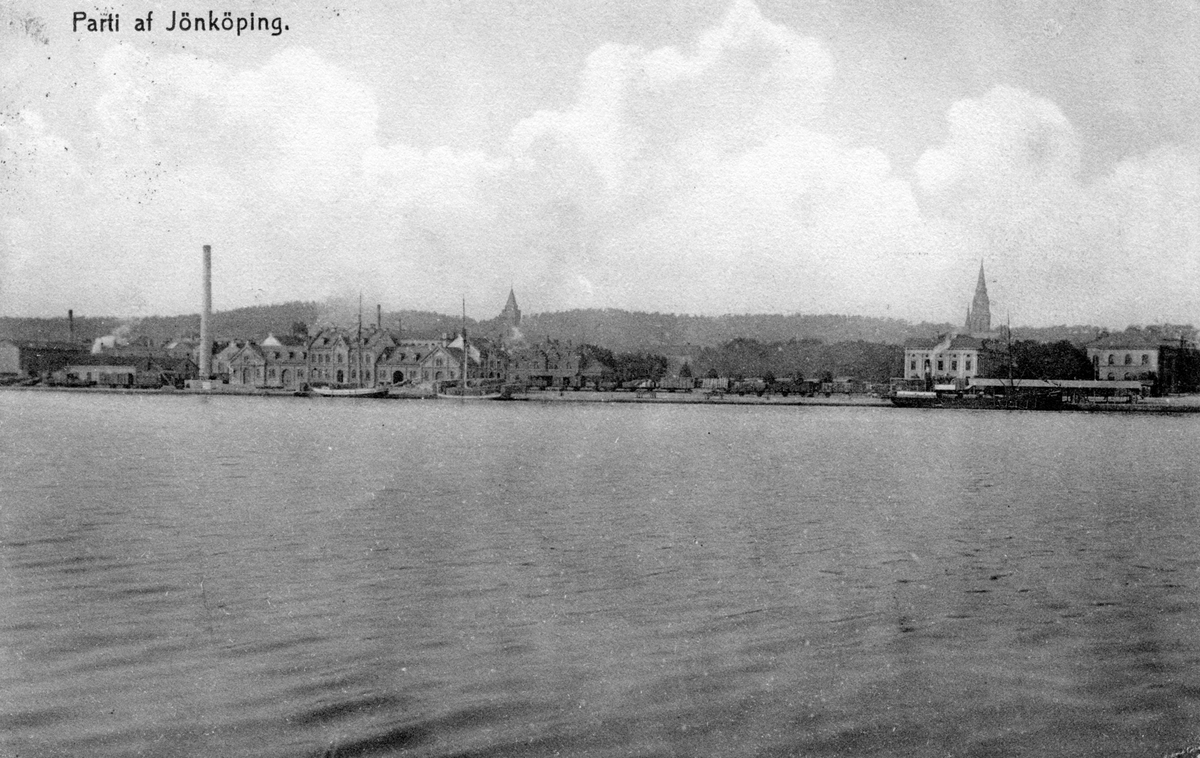 Vy över Jönköping. Munksjön med inre hamnen. I bakgrunden syns JMW med sin skorsten, bakom den sticker tornet på brandstationen upp och till höger syns tornet av Sofiakyrkan. Vykort skickat 1912-07-22.