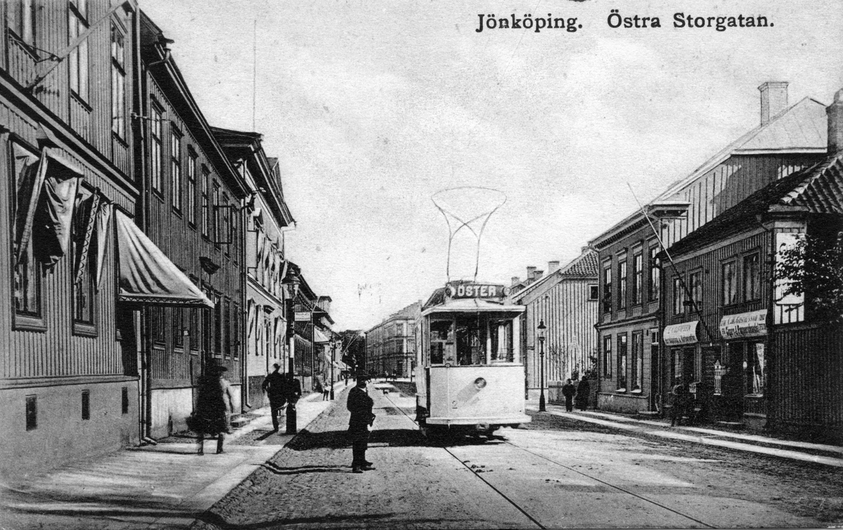 En spårvagn på Östra Storgatan i Jönköping. Vykort skickat 1909-06-15.