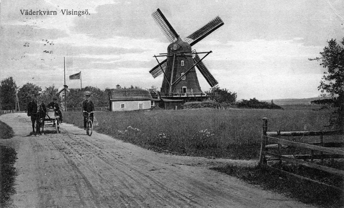 En väderkvarn på Visingsö. På grusvägen cyklar en man och en annan färdas med häst och kärra. Vykort skrivet 1923-07-22.