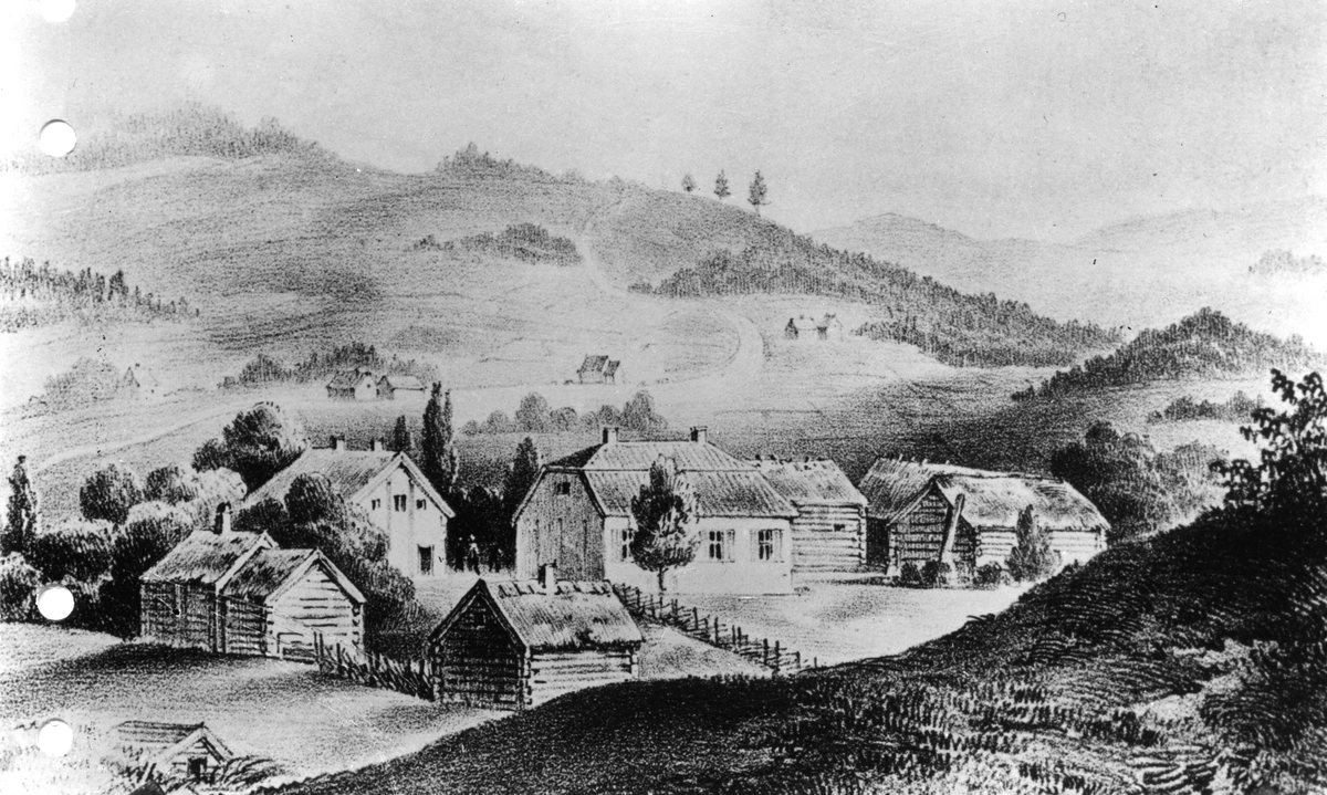 Gamla Ingaryd med gästgiveri, tingshus "tjuvakista" och spöpåle i Tenhult. Sista tinget hölls 1890. Foto efter en teckning av prof. J.K.Boklund.