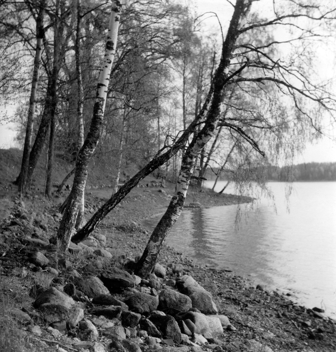 Tenhultasjön med björker i förgrunden.