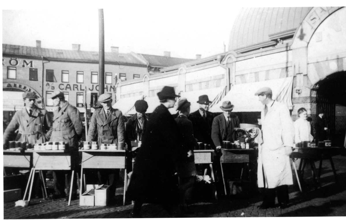 Honungsförsäljning från Lindome och Kållered på Kungstorget i Göteborg, 1940-tal. Till vänster ses Verner Karlsson (1897 - 1985) som säljer honung. Verner bodde i Tollered, Kållered och reste med honungsburkarna på tåget till Göteborg.
