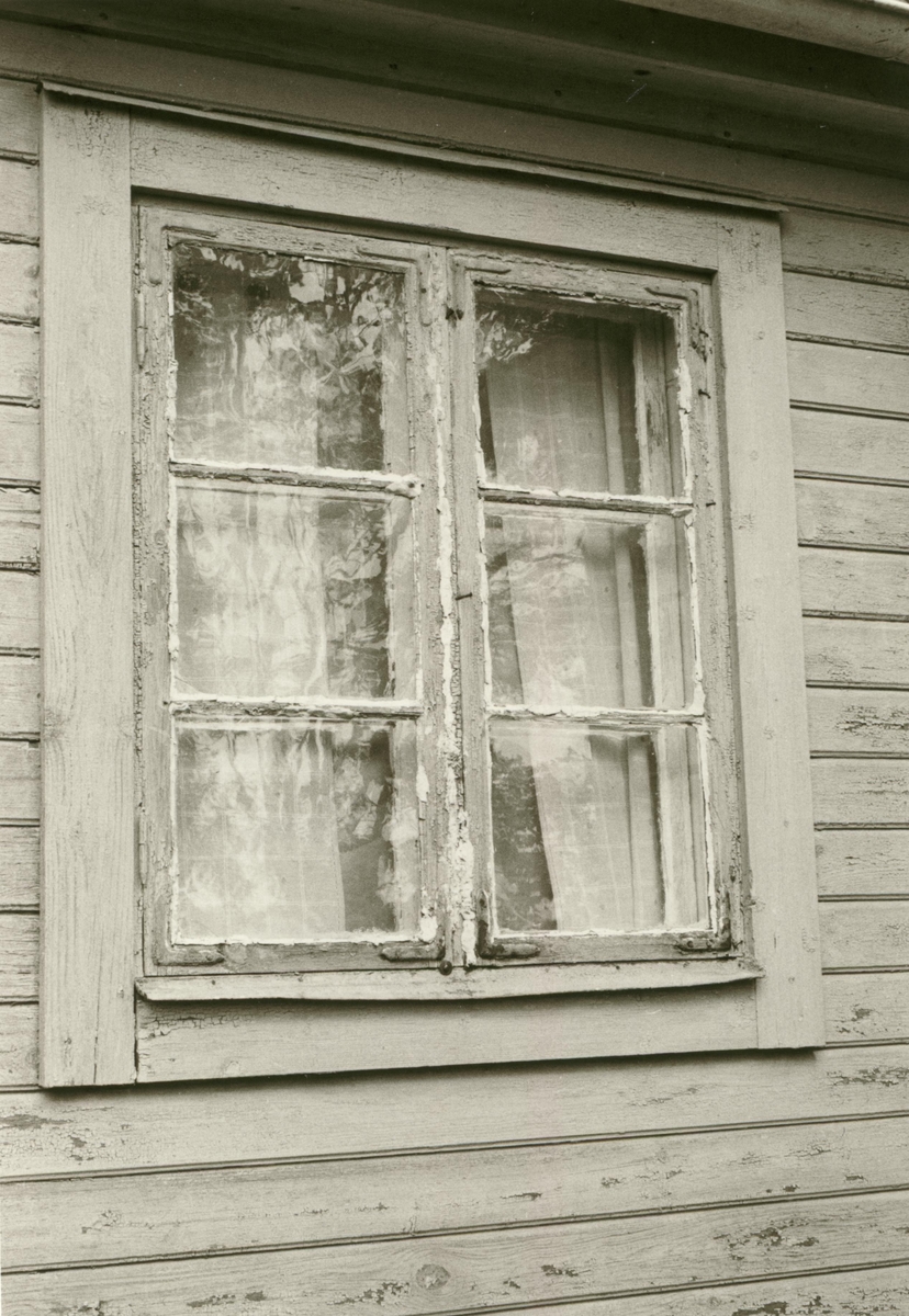 Detaljer på en enkelstuga i Rinkaby, Kalmar. Fönster, omgivet av liggande träpanel.