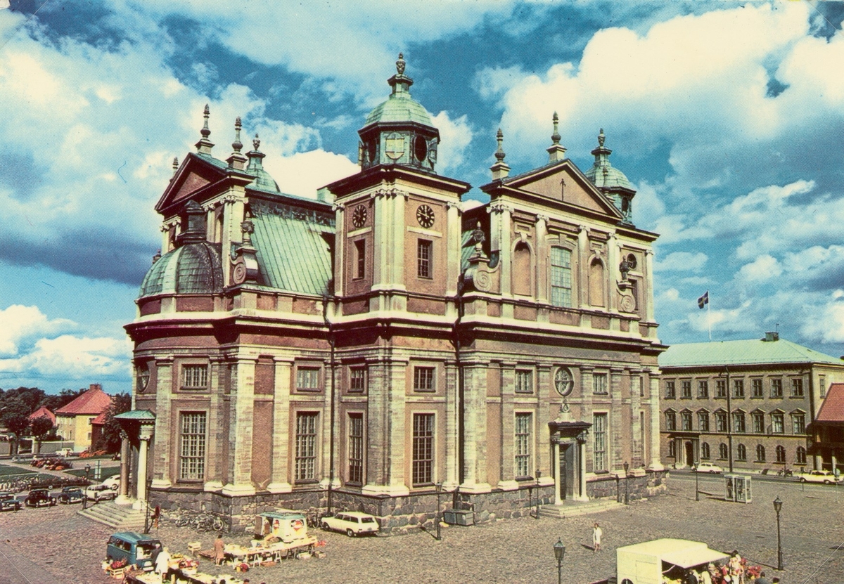 Vykort på Kalmar domkyrka. Den dominerande stilepoken exteriört och interiört är barock. Uppförande mellan 1660-1703.