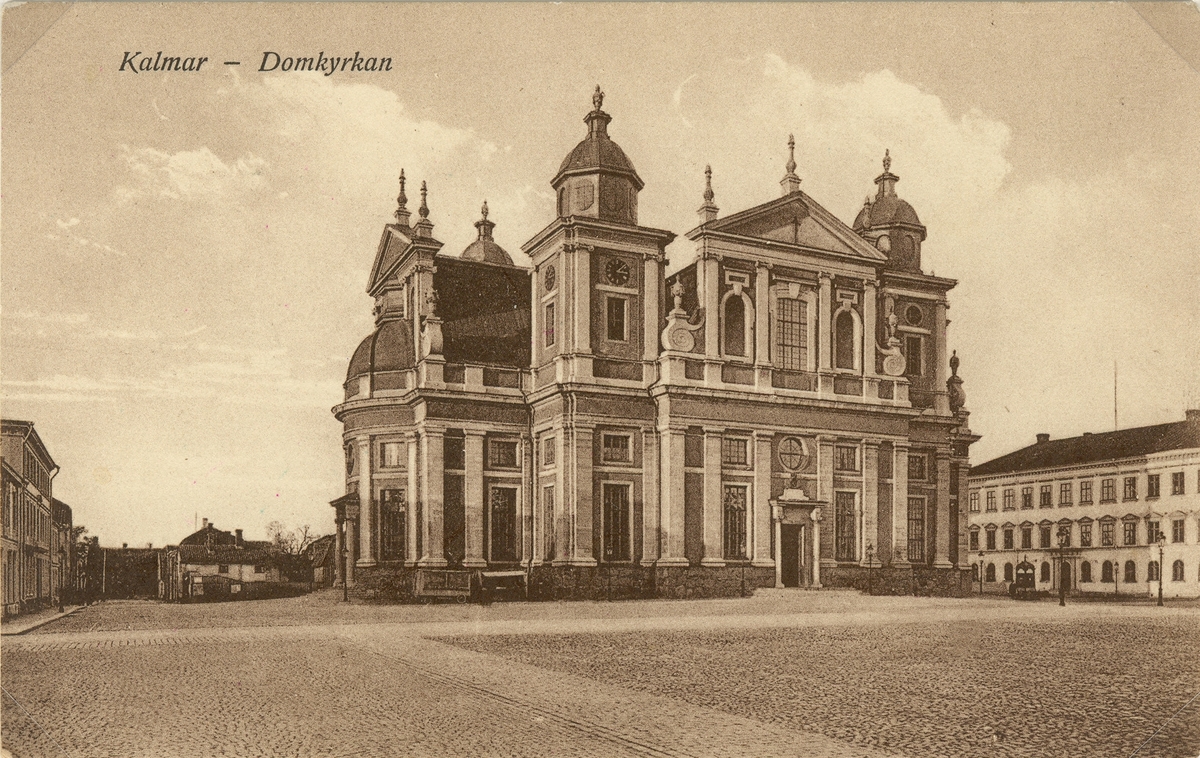 Vykort på Kalmar domkyrka, den dominerande stilepoken exteriört och interiört är barock. Uppförande mellan 1660-1703.