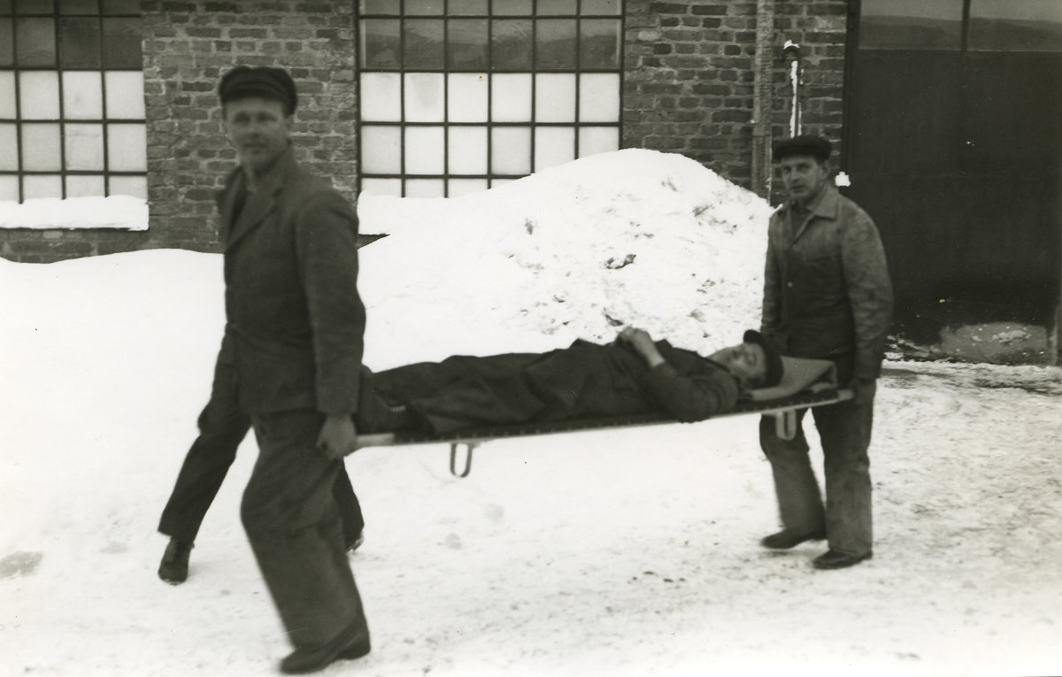 Civilförsvarsövning. På båren elförman Gustafsson. Arenco 1939-1940.