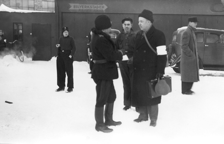 Brandchef Florin i samspråk med dr Yngve Wigh vid Röda korsets civilförsvarsövning.