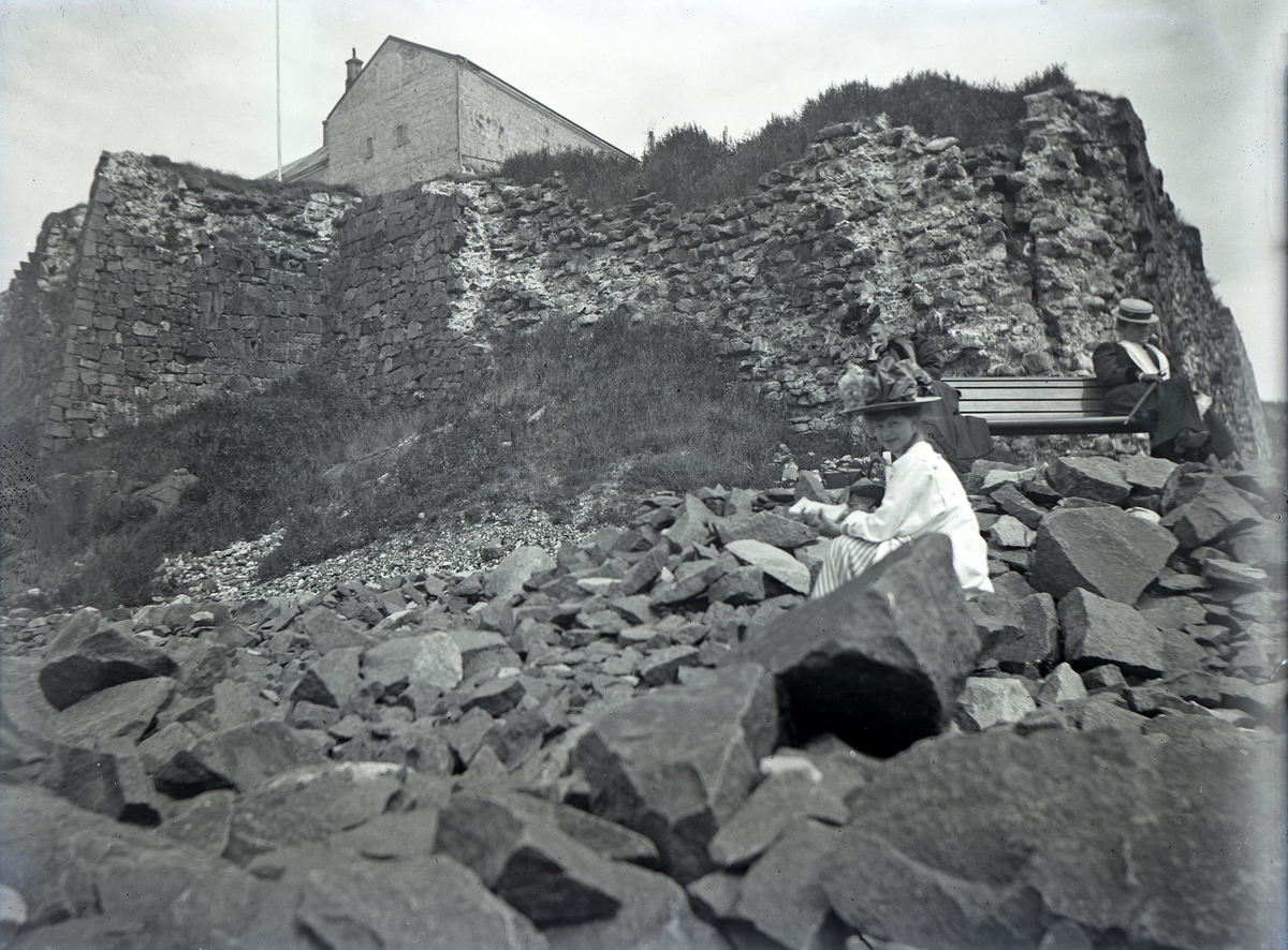 Tre kvinnor har slagit sig ner framför fästningsmurarna till Varbergs fästning. En yngre kvinna sitter bland stenskravel, de andra har slagit sig ner på en parksoffa.
