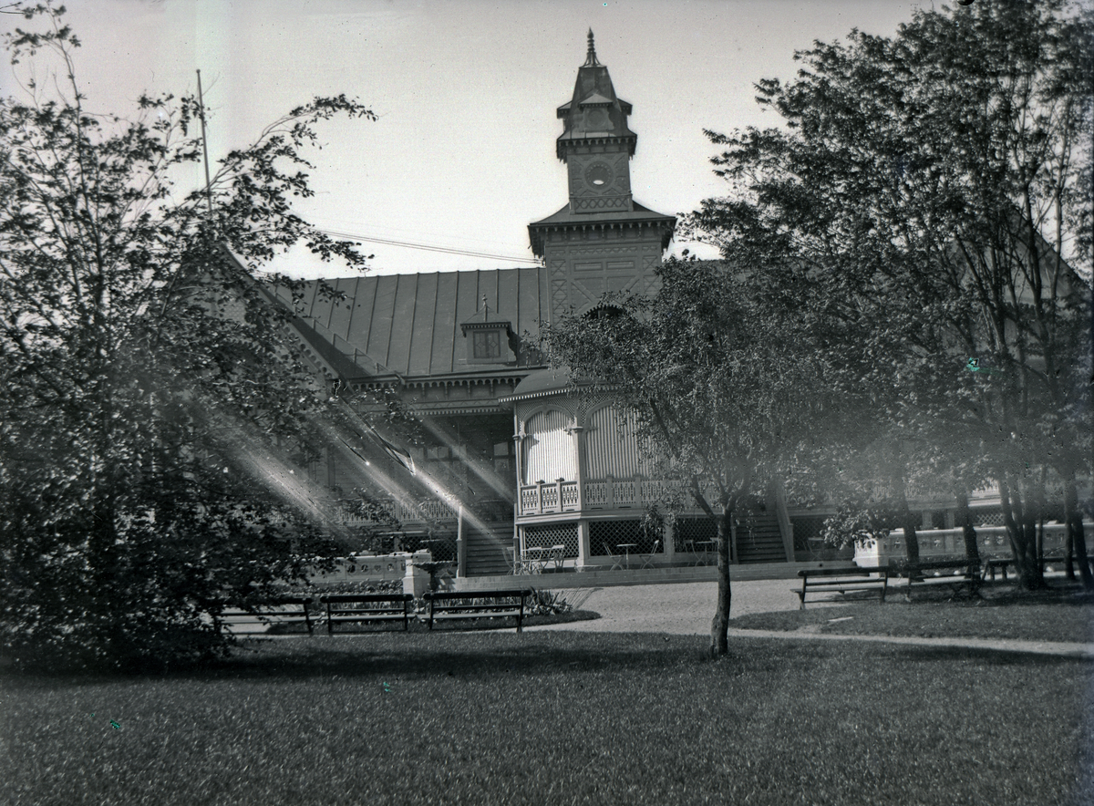 Vy av Societetshuset i Varberg från parken. Till höger skymtar ett s.k. "tufftuff"-tåg för barn.