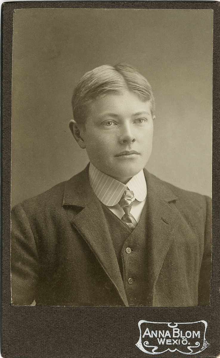 En ung man i kavajkostym med väst och randig stärkkrage med fluga.