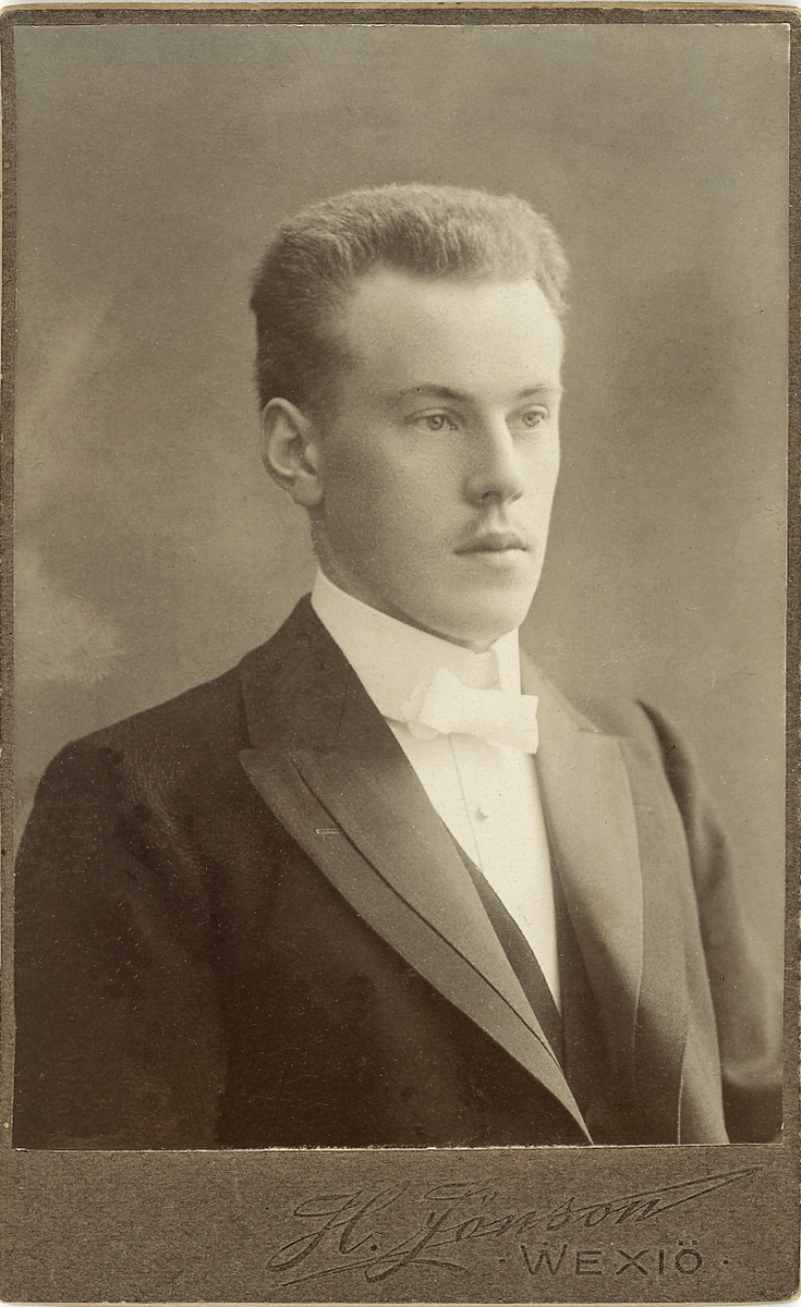 En ung man i frack (bonjour?) med väst, stärkkrage och fluga.