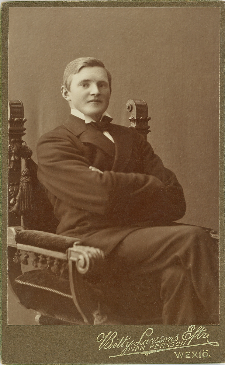 En man i mörk kostym med väst och stärkkrage med fluga, sitter i en utsirad karmstol hos fotografen.