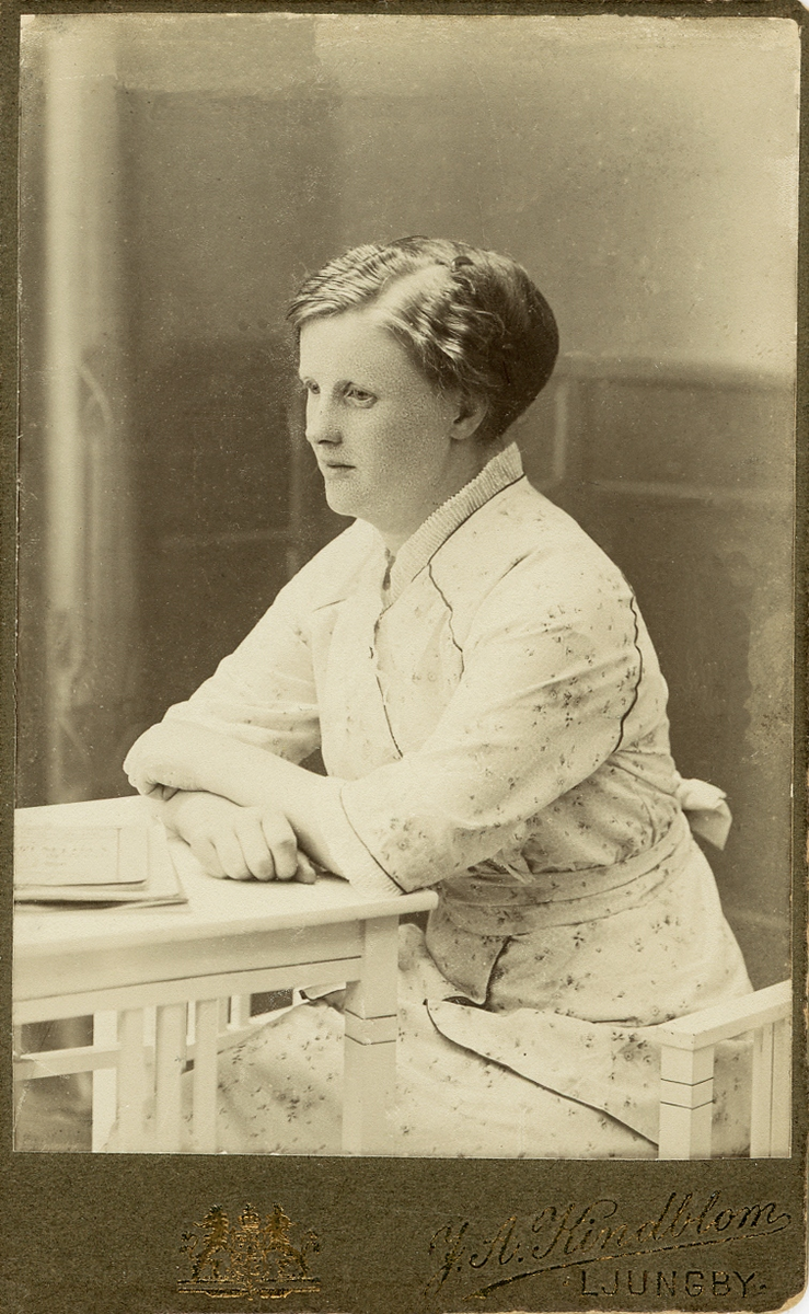 En ung kvinna i ljus, blommönstrad klänning med plisserad ståkrage sitter i en tankfull pose