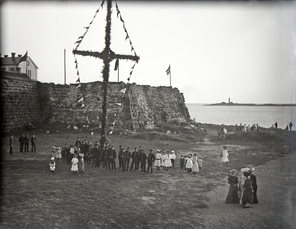 Ett kompani beväringar och några flickor har samlats vid midsommarstången (?) nedanför Varbergs fästning. Kvällsbild.