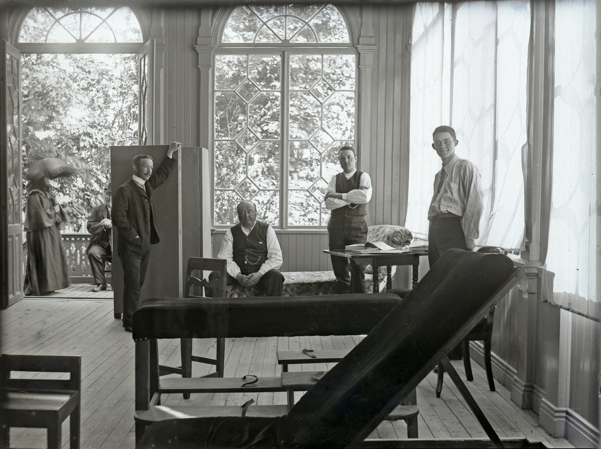 Ett rum med diverse gymnastikredskap (bänkar m.m.) för sjukgymnastik och massering. I bakgrunden syns några herrar, varav en verkar vara "patient". På verandan i bakgrunden skymtar två äldre personer.