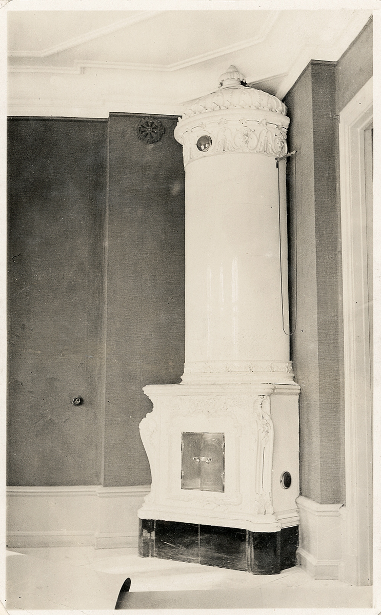En rund, ornerad kakelugn i fastigheten Vasa nr 5, Värendsgatan, Växjö, med div. anteckningar på baksidan av fotot.