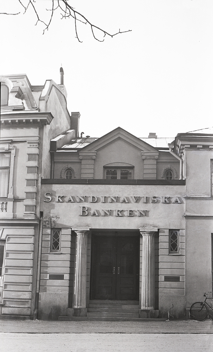 Skandinaviska bankens fastighet (fd Schanderska fastigheten) längs Kungsgatan, Växjö. Huvudingången, med en skymt av S.J. Johanssons