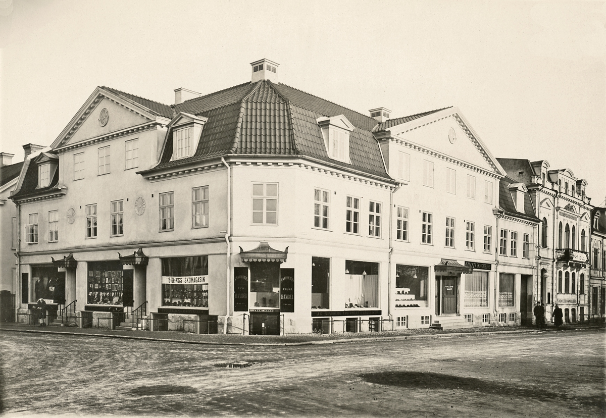Hörnet Kungsgatan/Norra Järnvägsgatan (kv. Linné), med bl a Billings skomagasin en kall vinterdag, efter färdig ombyggnation.