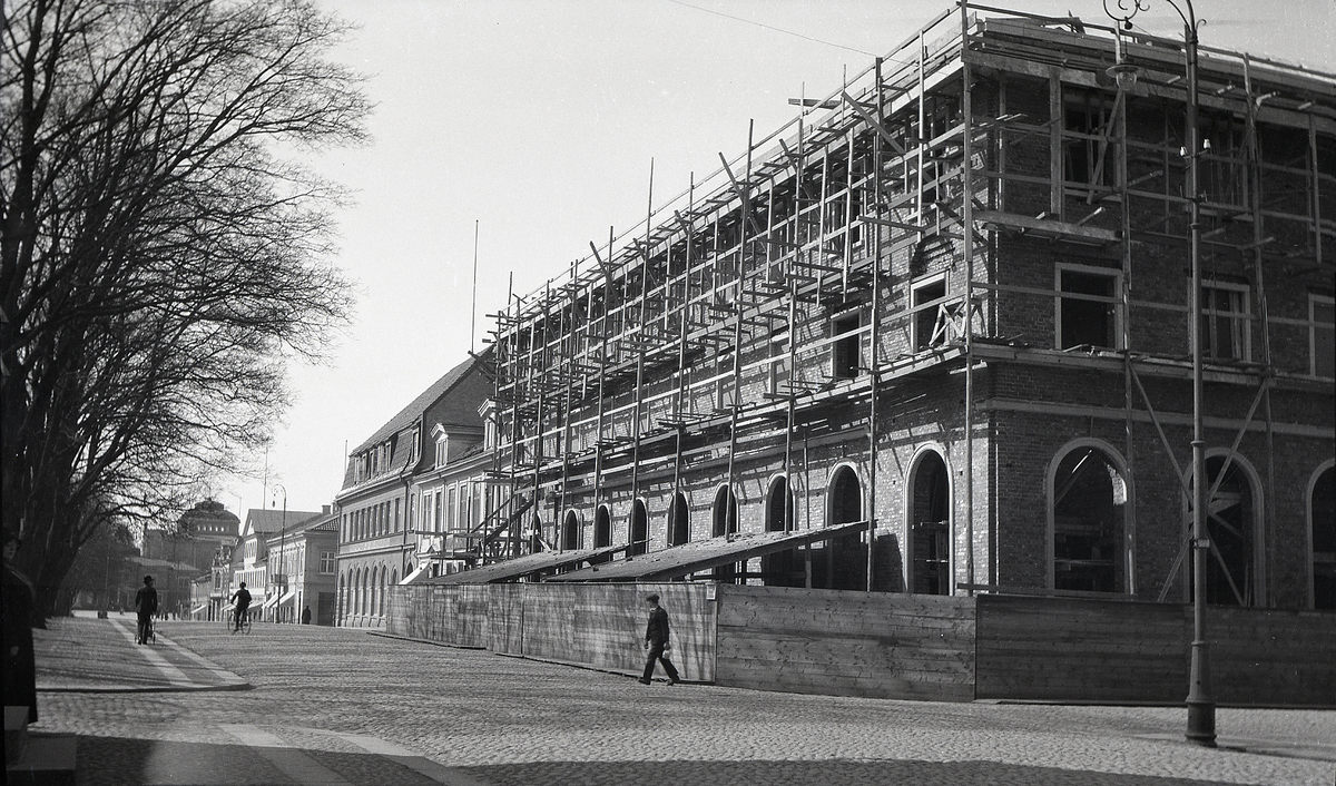 Sparbanksfastigheten på Kungsgatan, kv. Sunaman, under uppförande, med en vy utmed Kungsgatan med järnvägsstationen i fonden, bakom vilken läroverket tornar upp sig.