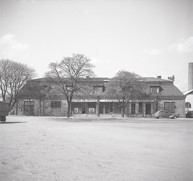 Vy från nuv. Oxtorget mot nordväst. På fastighetens skyltar kan man läsa följande fr. v. till h.: "Filadelfia", "Bilfirma A.G. Löfkvist" och "A.Dahlberg..."