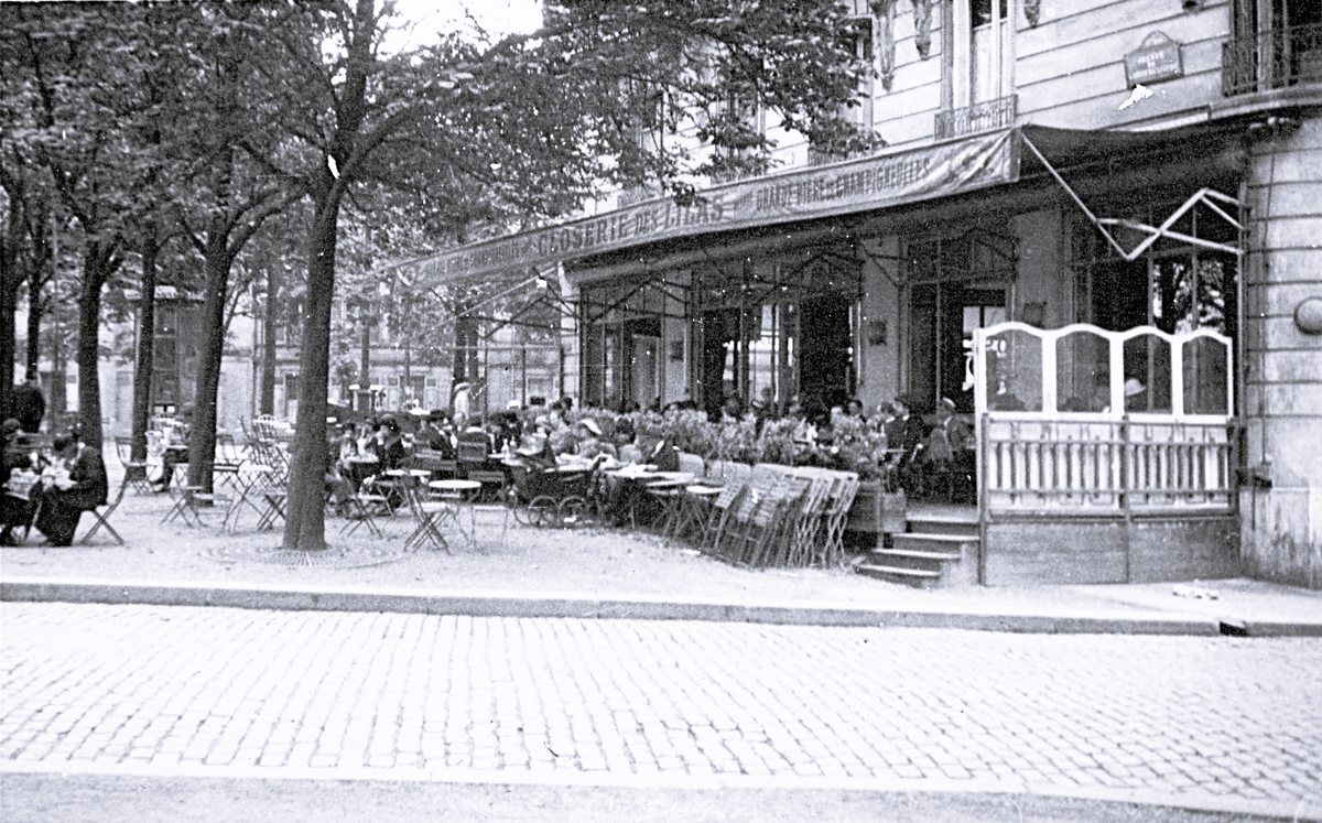 Titel: Foto av en gata med ett café och kullerstensbelagd gata, 1924-25.