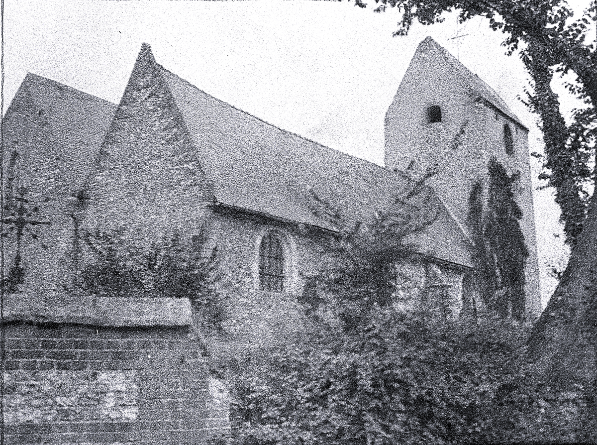 Foto av en kyrkobyggnad i Normandie, 1921.