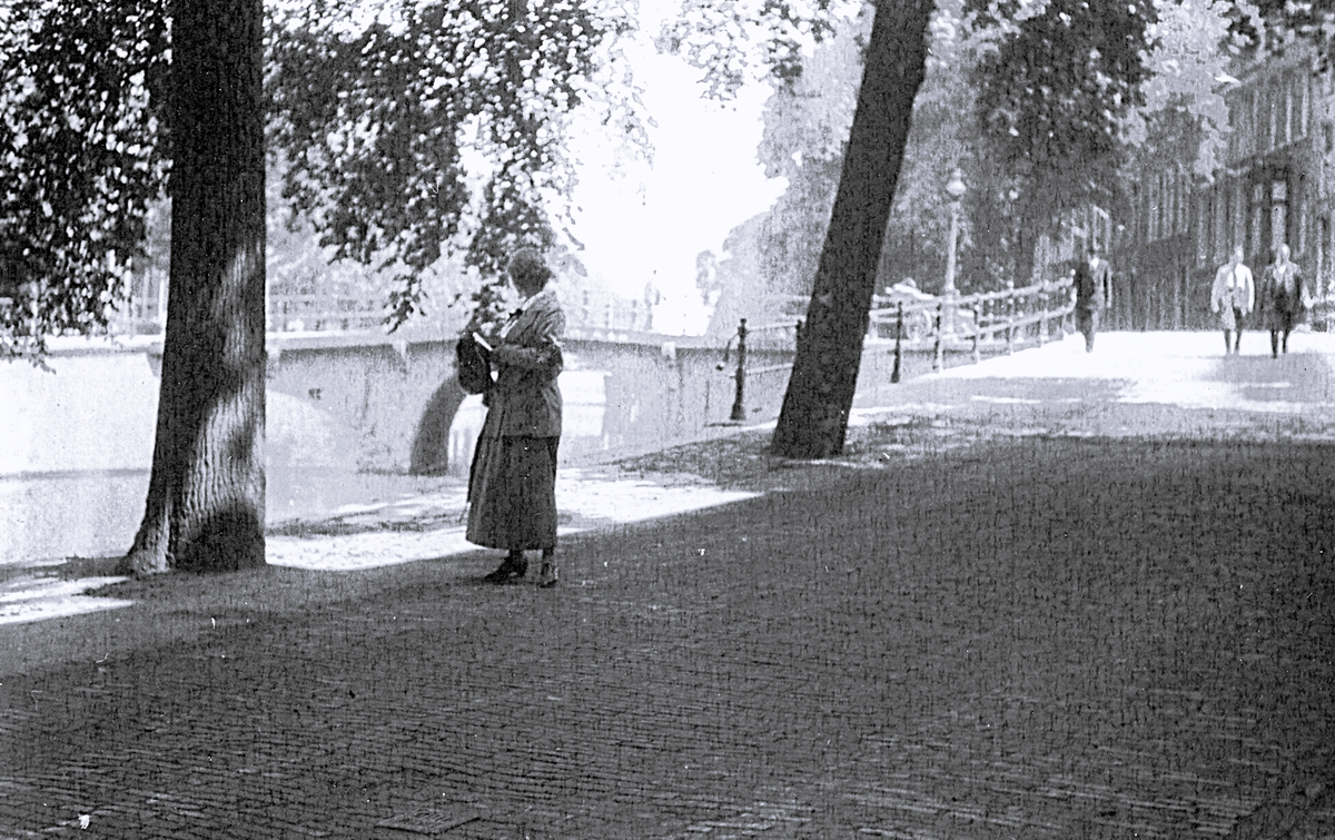 Foto av en kvinna som står vid en kanalkant, troligen i Amsterdam, 1924-25.